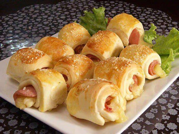 Dissolva o fermento no açúcar, misture o leite, os ovos, a margarina, o sal e, aos poucos a farinha de trigo peneirada. Trabalhe a massa até desgrudar das mãos. Coloque em uma tigela, cubra e deixe dobrar de tamanho, mais ou menos 1 hora. Trabalhe a massa novamente e divida-a em mais ou menos 15 partes (o tamanho a seu gosto) e com um rolo abra-as em um retângulo. Distribua o recheio de sua preferência (presunto, mussarela, requeijão, tomate e azeitona) e enrole-os como um rocambole. Coloque em uma assadeira untada com margarina e farinha. Deixe descansar novamente até dobrar de tamanho e depois pincele-os com gema e polvilhe parmesão. Asse em forno pré-aquecido a 200°C por aproximadamente 30 minutos ou até dourar. Sirva quente ou frio.
