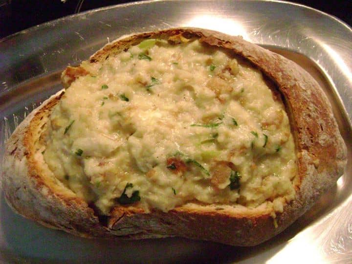 Primeiro comecei por retirar todo o miolo a um pão Alentejano.Cozi depois o bacalhau e na água da cozedura demolhei o miolo do pão. Retirei as espinhas do bacalhau e desfiei-o e reservei. Num tacho deitei azeite,o alho esmagado,a cebola picada, um pimento vermelho às tirinhas e pimenta preta moída , tudo em lume brando. Juntei depois o bacalhau desfiado grosseiramente e juntei um pouco de vinho branco .Quando parte do vinho reduziu deitei o pão e fui mexendo com a colher de pau. Quando a açorda estava com uma boa consistência, juntei mais água da cozedura do bacalhau. Piquei para lá bastantes coentros e duas gemas, mexi com a colher de pau e deixei apurar sempre a mexer. Deitei a açorda na côdea do pão e, levei ao forno pré-aquecido a 170 graus. Espero que apreciem.