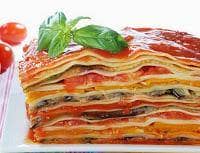 Coloque a massa na água fervendo com sal até ficar al dente. Retire e coloque sobre um pano de prato. Monte a lasanha colocando em um pirex um pouco de molho as tiras de massa cozida e uma camada de berinjela. Cubra novamente com tiras de massa cozida e coloque uma camada de abóbora. Continue do mesmo modo com os tomates e as abobrinhas até completar a altura da travessa. Por último complete com tiras de massa e cubra com o molho de tomate. Leve ao forno por alguns minutos para aquecer e pronto!