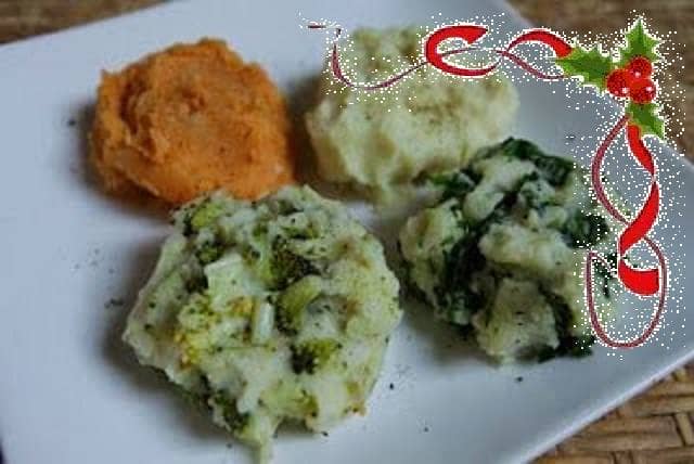 Doure 2 dentes de alho picados em 1cs de azeite. Junte 3x de espinafre lavado e picado e refogue durante um minuto. Tempere com sal e pimenta do reino e junte à receita básica de purê.