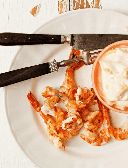 Camarões grelhados com maionese de gengibre e manga