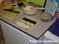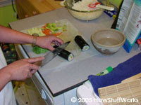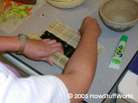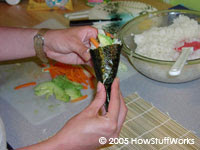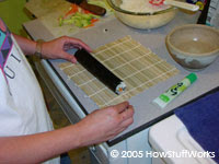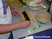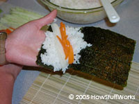 Futomakié o que muitas pessoas imaginam quando pensam em sushi. Primeiro, coloque uma folha de nori sobre a esteira de bambu (o lado brilhante para baixo). Cubra cerca de 2/3 do nori com o arroz (um pouco menos do que na foto). Coloque sua cobertura, de forma diagonal, por todo o arroz.