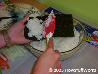 Agora vamos fazer um rolo de mão, ou temaki. Este é um cone de nori com o arroz e a cobertura por dentro. Comece com meio pedaço de nori. O temakié mais fácil de fazer, segurando o nori com as mãos. Espalhe o arroz no final do cone, cobrindo cerca de um terço dele. Coloque sua cobertura, de forma diagonal, por todo o arroz.