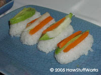 Tamago é uma omelete especialmente preparada adicionando-se camadas finas de ovos até que formem uma fatia grossa e densa. Depois, é prensada em um bocado de arroz de sushi com uma faixa de nori. O abacate é o ingrediente favorito no Japão, onde seu nome significa algo como “atum da terra”. Pepinos e cogumelos também estão em alta na lista dos ingredientes de sushi, mas você pode usar, teoricamente, qualquer vegetal.No Japão, não se costuma fazer o sushi em casa. Os sushi bares são em quase toda parte por lá e os japoneses geralmente sentem que apenas um chef perito em sushi pode fazer um sushi apropriado. Quando eles comem sushi em casa, costumam pedir. Entretanto, para eventos especiais, fazer sushi em casa pode ser divertido e delicioso.Escolhendo o peixe