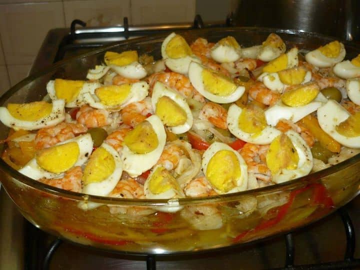 Fiz uma camada de cebola, de pimentões (vermelho e amarelo), batatas já cozidas, lascas de bacalhau aferventadas (ele já era dessalgado), alho em fatias finas, mais um pouco de cebola e pimentão, e por último o camarão.