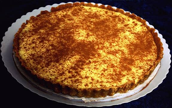 3. Coloque a bolacha numa tarteira com fundo amovível. Forre a tarteira com a bolacha e “aperte” bem para que fique uma base compacta. Leve ao frigorífico até que endureça.