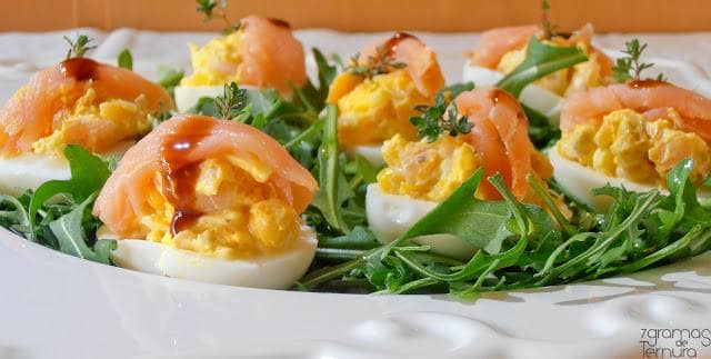 Coza os ovos durante 10 minutos, retire-os e deixe arrefecer. Coza o camarão em àgua e sal com 1 malagueta em pedaços durante 5 minutos. Descasque os ovos, corte-os longitudinalmente e retire-lhes as gemas com cuidado para não partir as metades brancas. Num recipiente misture as gemas, o milho, os camarões cozidos, o queijo ralado e o salmão em pedaços. Reserve alguns filetes de salmão para decorar. Junte a maionese e envolva bem. .Deite o recheio na cavidade das claras de ovo. Por cima coloque os pedaços de salmão fumado e um pingo de creme de vinagre balsámico. O recheio que sobrar, sirva com tostinhas. No prato de servir, coloque uma cama de rúcula (temperei com um fio de azeite ) e por cima os ovinhos recheados.E Bom Apetite!