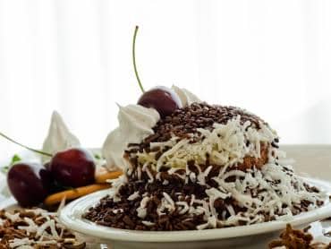 Faça camadas alternadas de bolo regado com guaraná, beijinho e ganache de chocolate, finalize com o chocolate e decore com coco ralado e raspas de chocolate