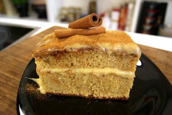 Para o recheio e cobertura, coloque todos os ingredientes em uma panela e cozinhe em fogo moderado misturando sempre com um fouet. Reserve para amornar. Monte seu bolo. Distribua metade do recheio no meio do bolo e o restante na cobertura. Polvilhe a canela em pó e sirva.