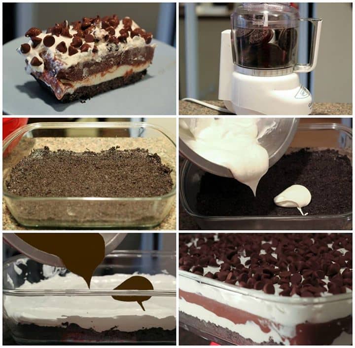 Triture todos os biscoitos no processador e coloque na tigela fazendo a base da lasanha, pressionando bem. Coloque a travessa na geladeira enquanto você trabalha nas próximas camadas.