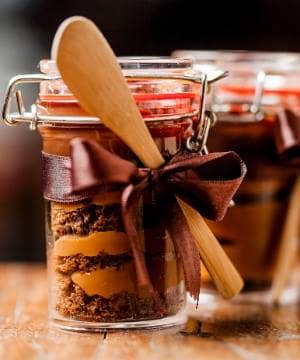 No fundo de um pote, acomode uma fatia de massa e cubra com doce de leite. Coloque mais uma fatia e mais uma de camada de doce.
