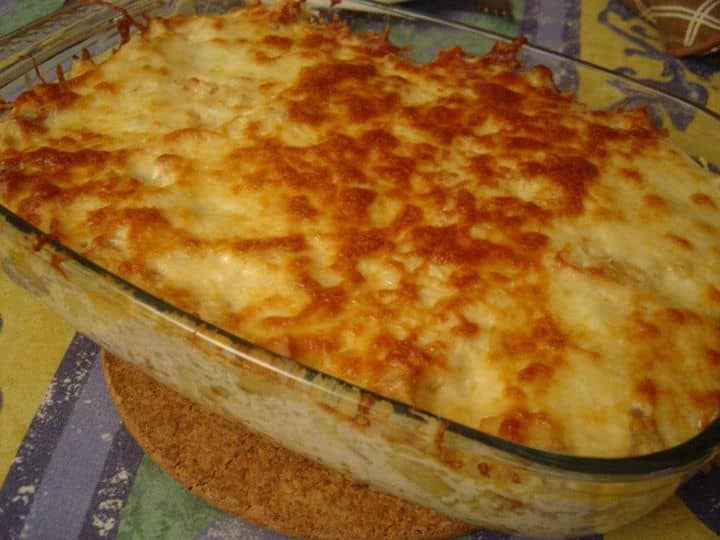 Bacalhau com natas Ingredientes: 2 pacotes de migas de bacalhau 1 litro de leite 2/3 cebolas 2 pacotes de natas para culinária 1 kg de batatas cortadas aos cubinhos creme de marisco q.b. azeite q.b. queijo ralado q.b. Cozer o bacalhau em leite, retira-se e guarda-se parte do leite. Fritar as batatas e reservar. Cortar…