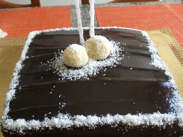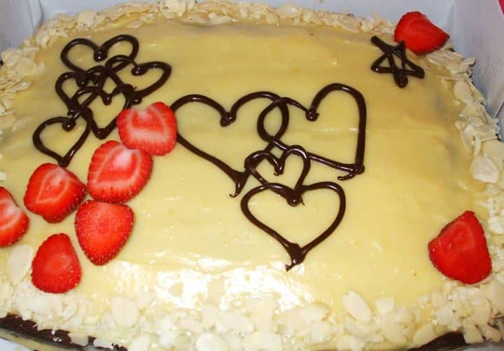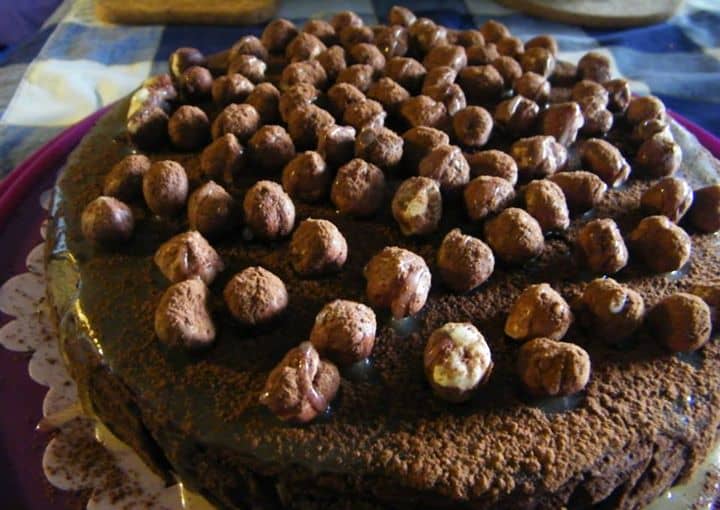 Bolo de chocolate com cobertura de caramelo e avelãs torradas